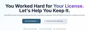 BoardWise is a secure, session-based digital suite for license defense. Built with zero data retention, advanced compliance safeguards, and a plain-language educational approach, BoardWise empowers professionals to respond effectively to licensing board complaints. With lifetime access at a one-time fee, BoardWise is making justice more accessible, affordable, and stress-free.